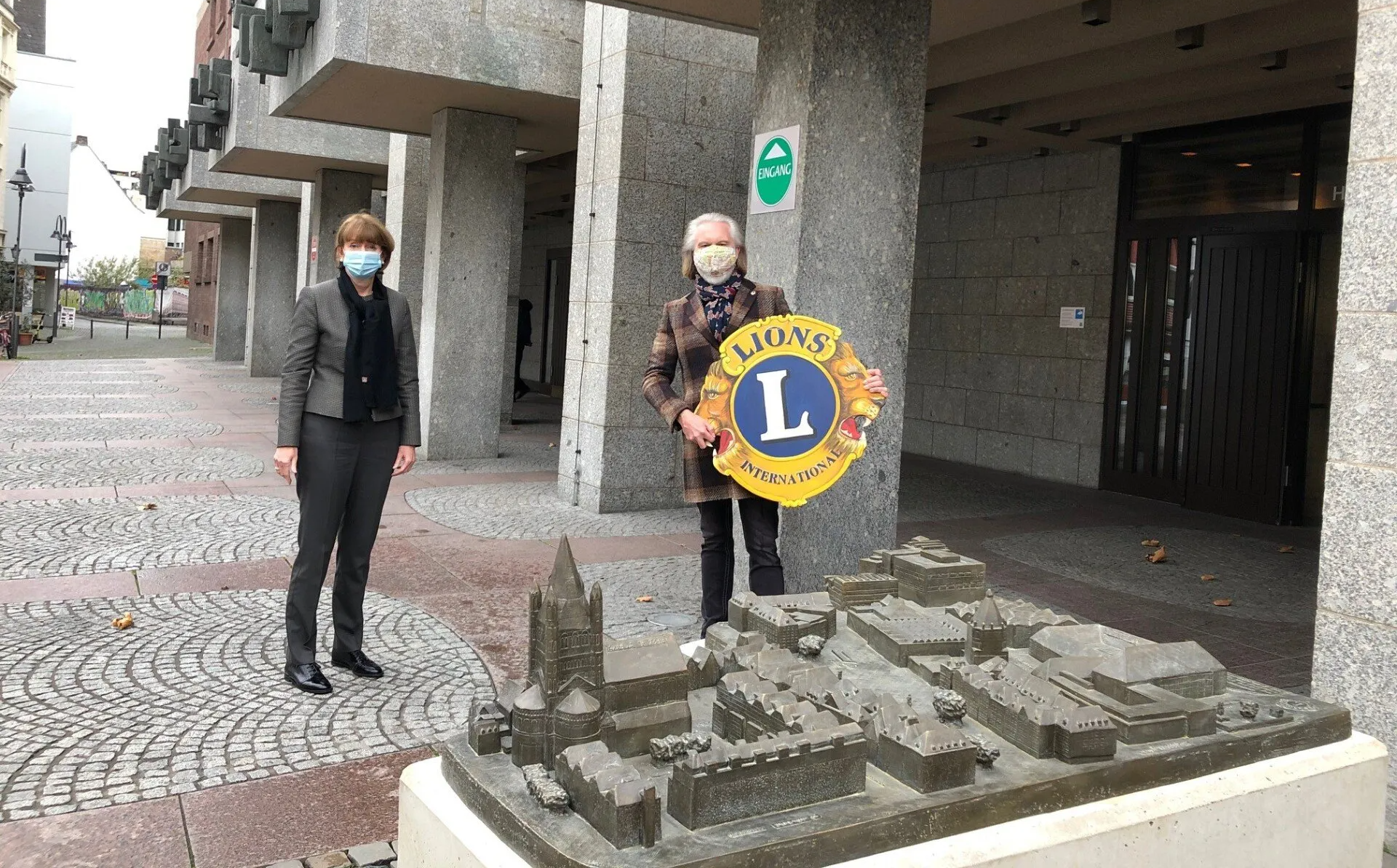 Im Bild: Frau Oberbürgermeisterin Henriette Reker und die Chair Person der Kölner Lions Clubs, Dr. Joachim A. Groth bei der coronagerechten Übergabe des Modells am 16. November 2020 nach einer mehrjährigen Umsetzung der Planung.